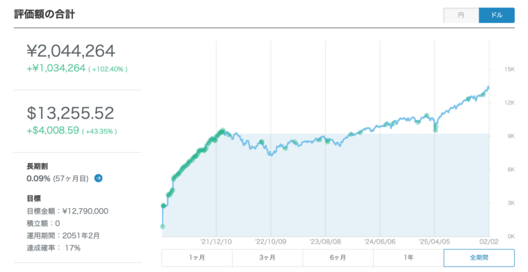 ドル建ては初期はマイナスが続いていましたが、やっと安定してプラスになってきました。