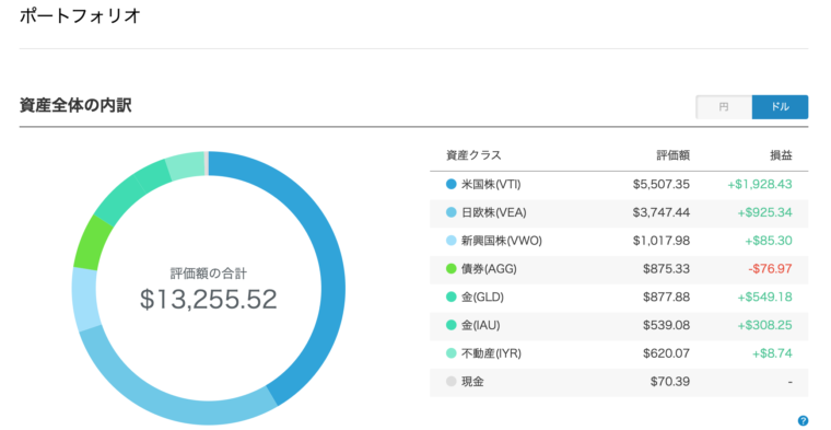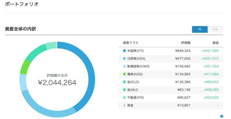 現在の資産のポートフォリオを円とドルベースで並べました。