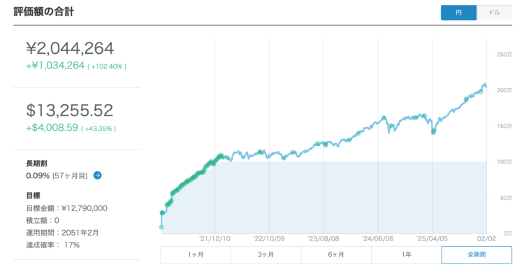 評価額も順調に推移してます。まだ、2倍を超えたばかりで、なにかあれば一気に落ちることはあるかもしれません。ただ、「〜ショック」が起きても、50%ダウンまでは耐えられるだけ上昇しています(半分になって元本)。割と順調です。