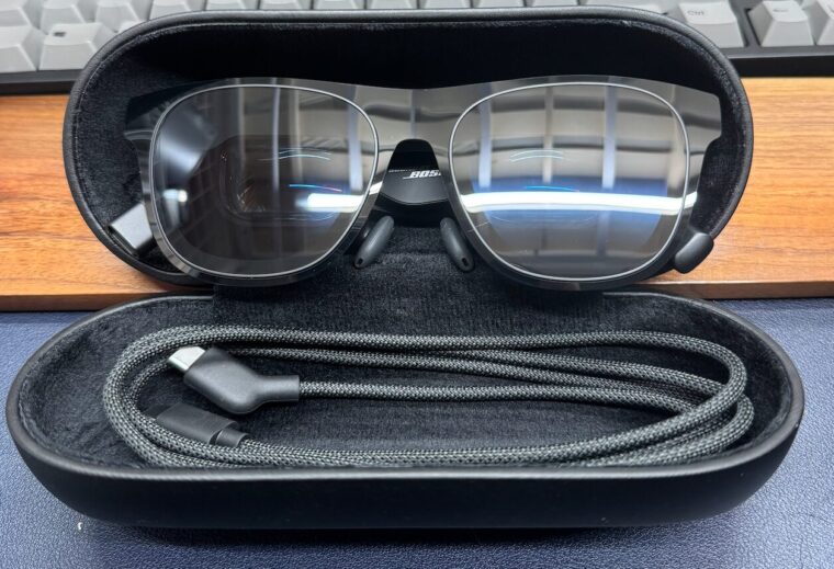 XREALOne Pro は、USB-C ケーブル一本で映像入力できるスマートグラスです。Quest3のような「VRゴーグル」ほど大げさではなく、ほぼサングラスの延長の形状をしています。